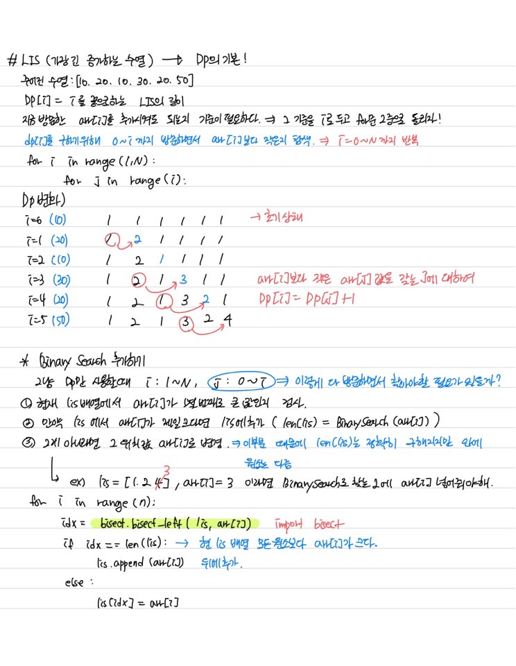 LIS의 구현 방법에는 기본 DP를 활용하는 방법과 Binary Search를 활용하는 방법이 있다. 만약 N이 O(N^2)로 처리할 경우 시간 초과가 날 만큼 크다면 반드시 Binary Search를 이용해서 풀어야 한다.